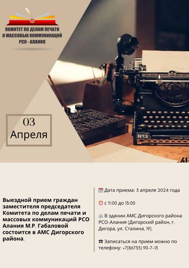 Заместитель председателя Комитета по печати РСО-Алания Мадина Габалова проведет выездной прием граждан в Дигорском районе Дата приема: 3 апреля 2024 года с 11:00 до 13:00 В здании АМС Дигорского района РСО-А (г.