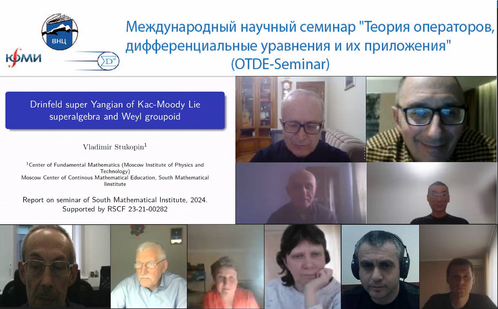 На заседании вниманию слушателей семинара был представлен доклад д.ф.-м.н., профессора, доцента кафедры высшей математики Московского физико-технического института Стукопина Владимира Алексеевича на тему «Янгианы Дринфельда супералгебр Каца-Муди». Отметим также, что Владимир Алексеевич является ведущим научным сотрудником отдела математического анализа Южного математического института ВНЦ РАН. Владимир Алексеевич является специалистом в области квантовых алгебр и групп.