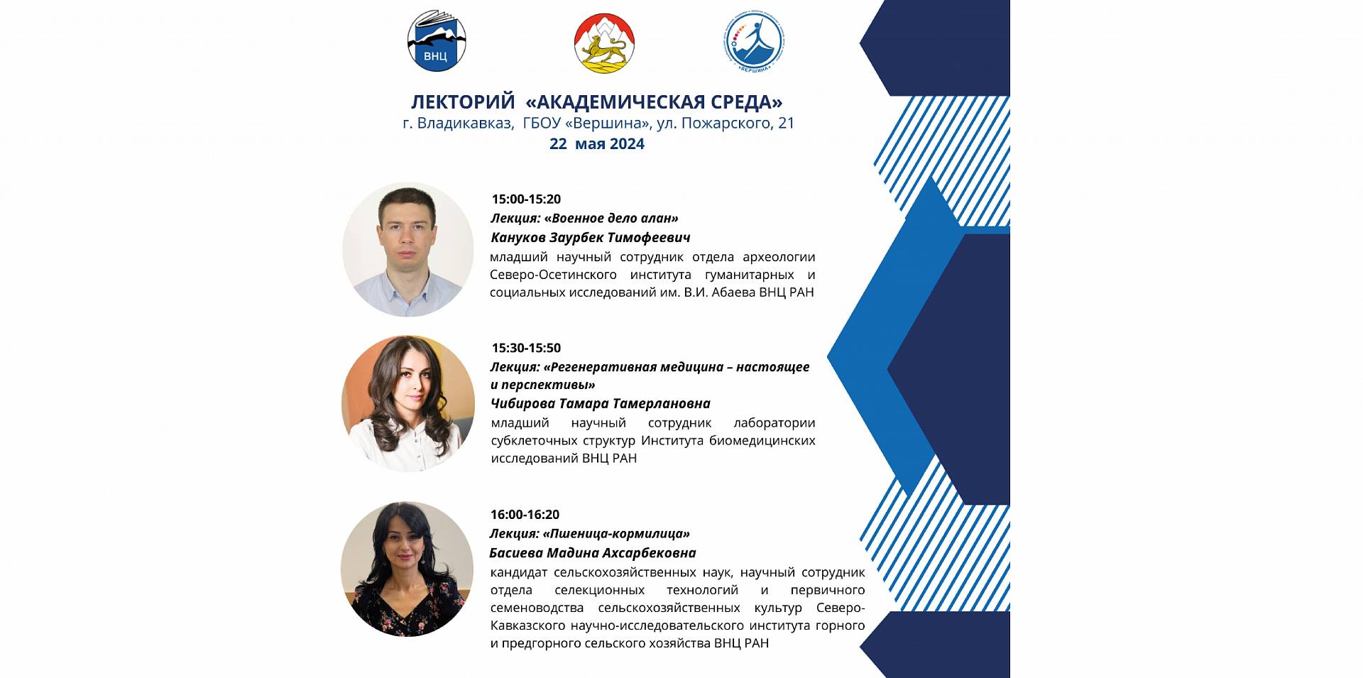 Владикавказский научный центр РАН и Центр «Вершина» информируют, что 22 мая 2024 года в 15:00 в конференц-зале ГБОУ «Республиканский центр выявления поддержки и развития способностей и талантов детей и молодежи «Вершина», расположенный по адресу г. Владикавказ ул. Пожарского 21, состоится восьмая сессия «Лектория «Академическая среда» для учащихся 8-11 классов общеобразовательных организаций РСО-А (далее – Лекторий).
