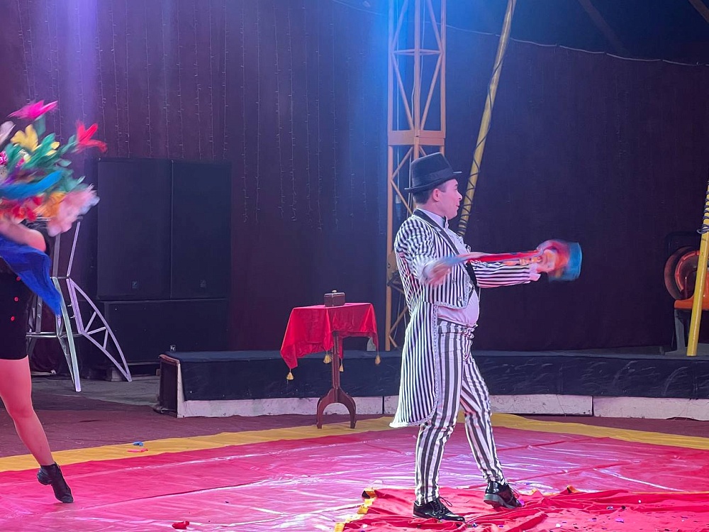 В программе представлены более 12 цирковых номеров. Метание ножей, клоуны, жонглеры, дрессированные животные и главный номер - леопард под куполом шатра.