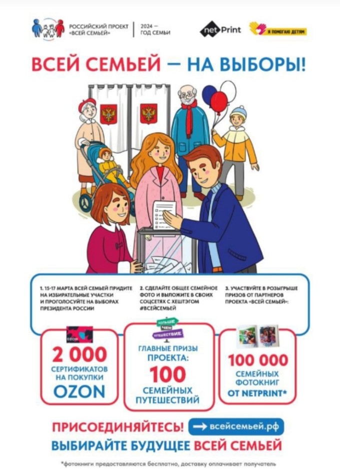 Для этого с 15 - 17 марта необходимо прийти на избирательные участки вместе с со своими родными и близкими, проголосовать и сделать общее семейное фото, например на фоне участка.