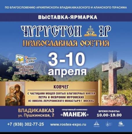 Настоящим информируем, о том, что в связи с запретом, до особого распоряжения, в Северной Осетии массовых мероприятий, выставка-ярмарка «Чырыстон Ир – Православная Осетия», запланированная на 3 - 10 апреля 2024 в г. Владикавказе переносится на 6 – 14 июля 2024 г. и будет приурочена к празднику св. Петра и Февронии.